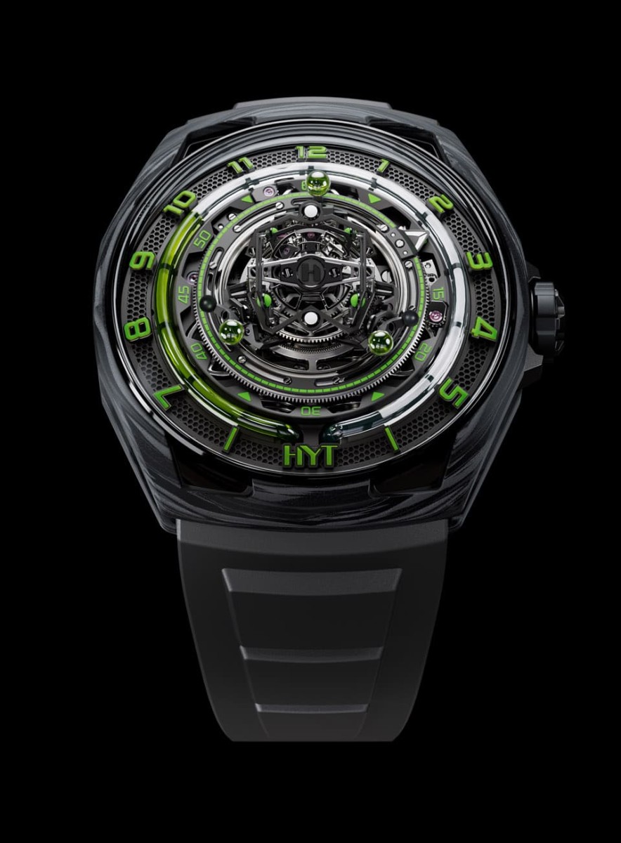 以逆跳流體小時顯示聞名的HYT將呈現Conical Tourbillon這款大作,手錶以碳纖維搭配DLC鈦金屬製成,面盤除了流體小時顯示外,位於中心的圓錐形陀飛輪也非常搶眼,其中蘊含隨著陀飛輪旋轉的螢光綠色寶石,與同色的流體小時與阿拉伯數字時標相呼應,這款錶搭載701 TC手上鍊機芯,機芯零件外觀有別於手錶科幻的外觀,採用傳統高級鐘錶修飾工藝處理,俐落講究的設計讓人看得大飽眼福。