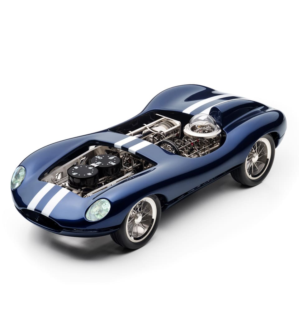 桌鐘/座鐘專家L'?P?E打造的作品常跳多傳統的鐘錶形式,例如這次展出的Time Fast II便是一款賽車風格桌鐘,品牌參考了1960年代的賽車設計,以鋁金屬製作底盤、不鏽鋼製作輪圈,內部則是搭載兩枚獨立機芯,其中一枚負責顯時,另一枚則是用以展演活塞運動的動偶效果。Time Fast II車室連排檔桿都做出來,而且它實際上還有功能可以用來替兩枚機芯上鍊或設定在空檔的位置。L'?P?E分別推出五種車色,每色限量99件,參考價則為NT$ 1,460,000。