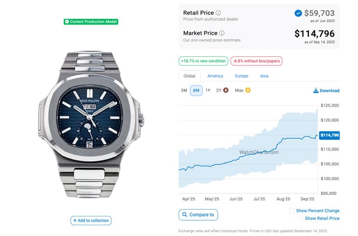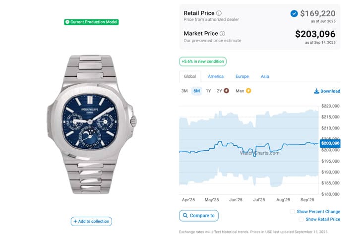 根據高級手錶市場調查研究機構WatchCharts的資料,5811/1G在2025年3月的身價還有141,538美金(約合台幣426萬2),這已經是手錶跌了三年後的表現,其他的型號在同時期的身價分別為5726/1A:103,086美金(約合台幣310萬4)、5990/1A:119,214美金(約合台幣359萬),以及5740/1G的198,740美金(約合台幣598萬5),每款都處於超定價狀態,而且溢價率都還不是一點點而已。