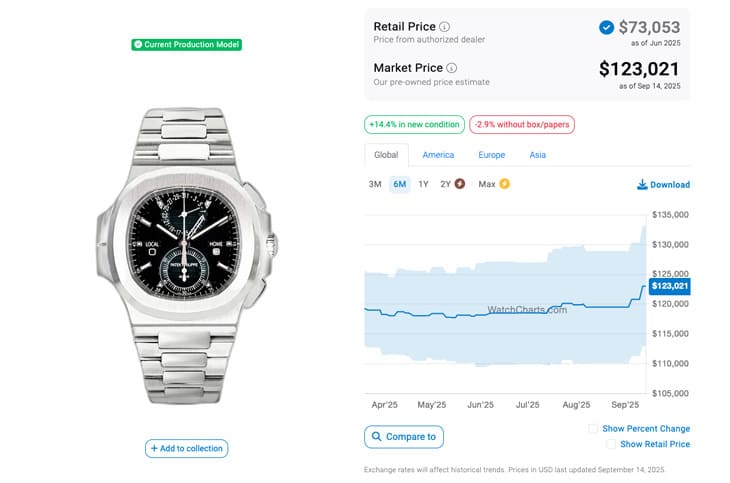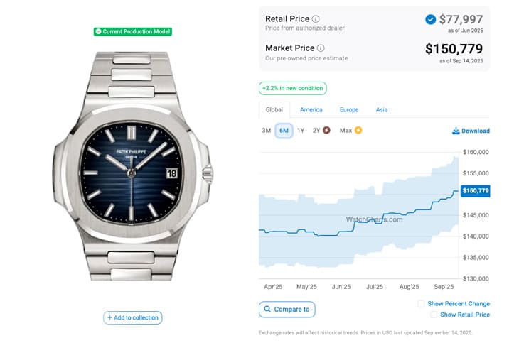來到2025年9月,距離前述觀察期約莫過了半年之久後,同樣由WatchCharts網站查找到的行情資料,四款錶裡面身價都比半年前為高,在行情成長的部分,近期表現最亮眼的是5811/1G-001,它在2025年6月後迄今氣勢超旺一路上揚,最近一個月身價成長幅度約4.5%,如今的二級市場價格衝到150,779美金(約合台幣454萬),直接寫下過去半年來的新高。而5990/1A-011在進入到9月後行情也有所成長,與上個月甚至是半年前都拉出一小段距離,行情依舊優異,有123,021美金(約合台幣370萬4)的水準。而前幾個月扶搖直上的5726/1A-014 到了這一個多月終於有點放緩的跡象,二級市場如今報價為114,796美金(約合台幣345萬7);5740/1G-001也是近一個月內保持平穩,它原本在2025年5月後行情有小漲一點上來,前幾個月則又持續下滑,8~9月的變化很。缃裆韮r還是有約203,096美金(約合台幣611萬6),約和今年6月差不多水準。