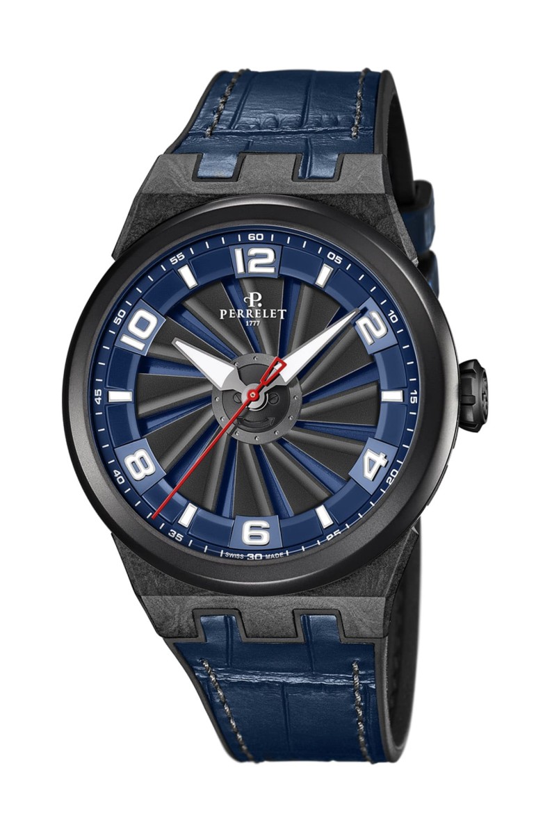 PERRELET採用堅硬輕巧的碳纖維製作錶殼,錶圈與底蓋邊緣則為黑色PVD不鏽鋼材質,因此腕錶外觀的黑色會有不同層次,碳纖維呈現不規則獨特紋理、不鏽鋼材質則為平順的霧面造型,品牌分別選用「午夜藍」以及「森林綠」兩大人氣流行色妝點旋風技術機制,除了下層面盤分別有藍色與綠色色塊,包括面盤邊緣的時標刻度環也呈現相同的顏色,而雖然兩款錶的秒針都是顯眼的紅色,不過PERRELET分別針對「午夜藍」和「森林綠」款式採用不同顏色的夜光塗層,前者為白色、後者則是米白色,進一步塑造兩款腕錶細緻的個性化視覺差異。