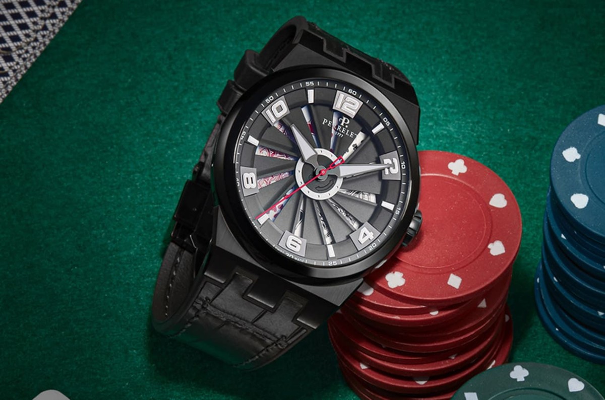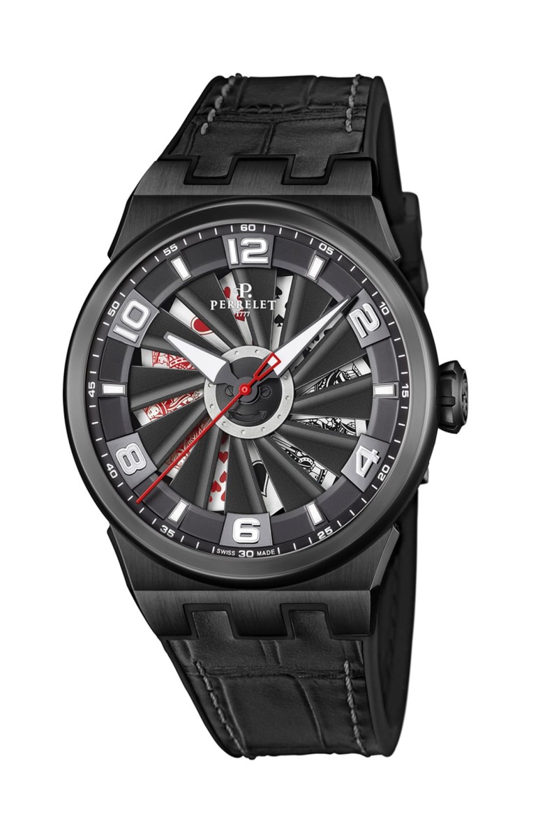 PERRELET以撲克牌為主題,催生出這款讓人彷彿置身賭場享受博弈樂趣的限量版Turbine大三針。腕錶以黑色PVD不鏽鋼製作,搭配同色蘊含橡膠襯裡的黑色鱷魚紋皮革錶帶,塑造出低調中帶有酷勁的造型。錶款的精華呈現在旋風技術機制的下層面盤,品牌在下層面盤放上紅心和黑桃花色的同花順撲克牌組合,總共有12張牌,包含兩個花色的A、K、Q、J、10,再加上象徵幸運的數字”7”,譜出一套在牌桌上戰無不勝的王牌,尤其是每當渦輪快速旋轉時,下層面盤的撲克牌組合會因為視覺效果隨著葉片轉得愈快而看得愈清楚,加上面盤以黑、白元素為主的設計很能呼應賭場氛圍,佩戴在手彷彿帶著走的幸運符般予人滿滿好兆頭。透明底蓋12點方向印有錶名以及限量資訊(限量50只),小小細節卻能大大增添手錶的收藏意義,同時佩戴者還能一併欣賞機芯蘊含PERRELET標誌的鏤空自動盤,以及底板上的大片魚鱗紋,紮實的零件作工水準與腕錶能通過瑞士天文台認證關係密切。