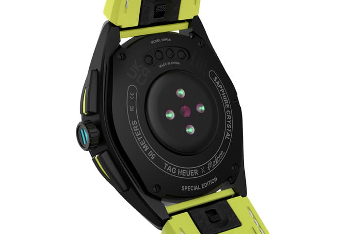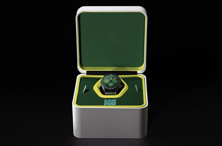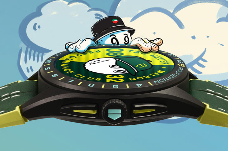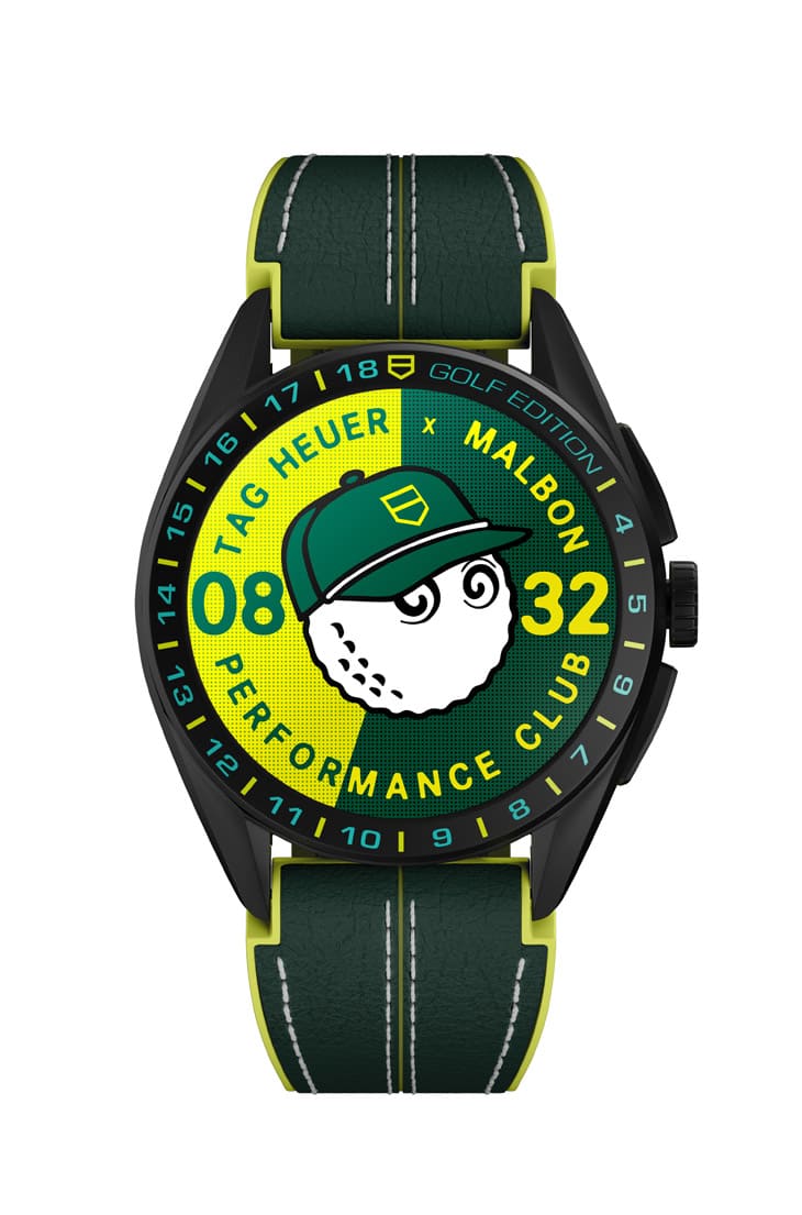 泰格豪雅為手錶配置點綴黃色調的深綠色橡膠與小牛皮複合材質錶帶,呼應錶殼細節的顏色;不只錶帶,品牌也特地結合MALBON GOLF的元素創作出兩款獨特錶面,畫面中可見MALBON GOLF的動畫式代表人物,它戴著印有泰格豪雅盾牌標誌的球帽,而且這個人物還會隨著分秒變化而有不同動作,彷彿住在手錶裡面一樣洋溢趣味,此一錶面適用於所有Connected智能錶,因此如果只是單純喜歡這個錶面造型的Connected智能錶錶主,也可以逕行下載來使用。另一種錶面則和泰格豪雅自身比較有關,其能呈現出與Heuer 02機芯連結的造型。