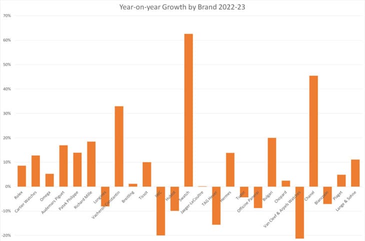 那麼2023年銷售額進步幅度最大的品牌是誰呢?答案是平價入門錶大戶SWATCH,他們在2023年推估的銷售額為6.6億瑞郎,在銷售額排行榜上名列第13(2022年可是連前20名都還排不上),這樣的銷售額與2022年一比較又巨量提升了63%之多,沒有懸念地成為2023年瑞士錶壇銷售額進步幅度最大的品牌。