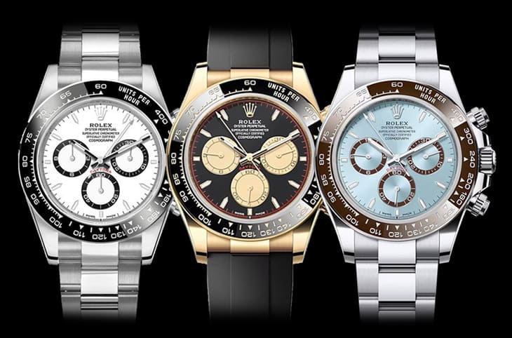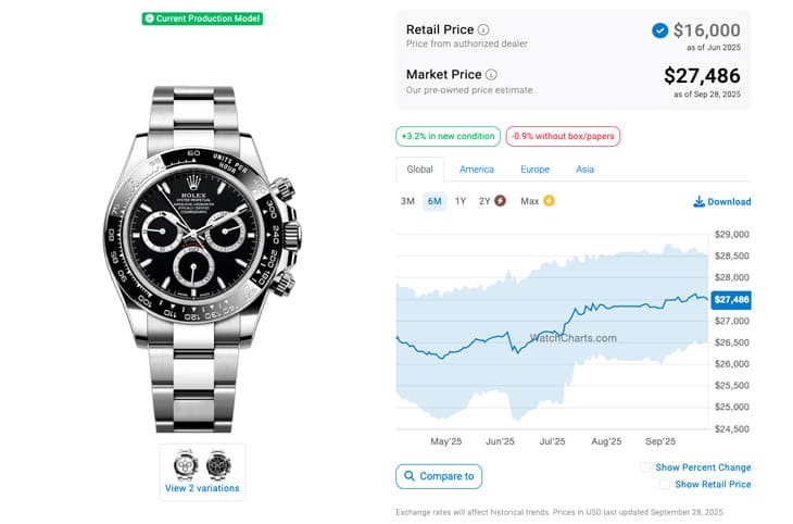 根據高級手錶市場調查研究機構WatchCharts的資料,現行版Daytona系列各種材質在2025年4月時二級市場的價格早已經開始由高點往下走,鋼殼白面126500LN-0001那時的行情為30,904美金(約合台幣94萬2)、鋼殼黑面126500LN-0002為26,589美金(約合台幣81萬)、半金時標鑲鑽款126503-0002為23,544美金(約合台幣71萬7)、永恒玫瑰金款、黃金款、鉑金款型號126505、126518LN、126506的身價依序是49,805美金(約合台幣151萬8)、43,436美金(約合台幣132萬4)和107,210美金(約合台幣326萬8),除了永恒玫瑰金之外,金額大多數在定價以上,系列的高人氣由此可見一斑。