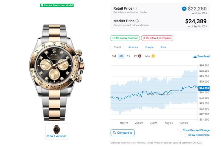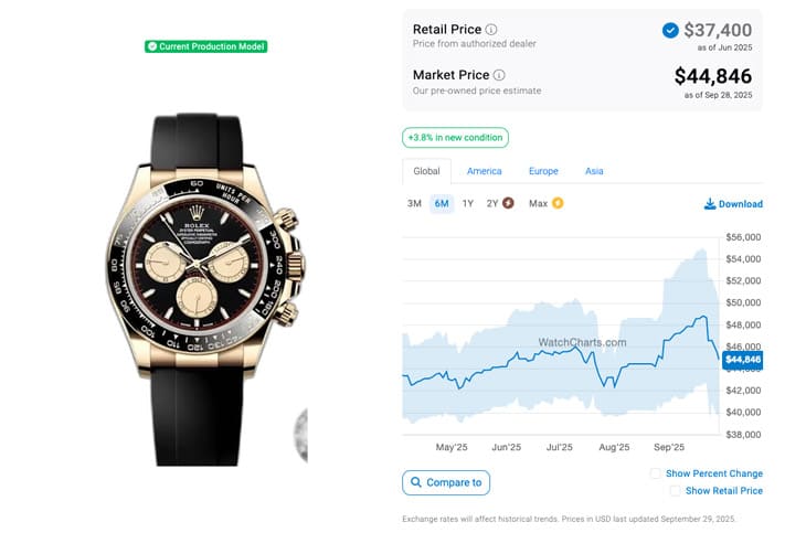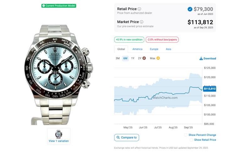 到了2025年9月底,當現行版Daytona進入二級市場的款式與數量愈來愈多,加上熱門錶行情下修的趨勢似乎已到谷地反彈的地步,因此前述的六種型號身價起起伏伏後,比起半年前大多有所成長。同樣由WatchCharts的資料可見,目前Daytona各款最新報價分別是鋼殼白面126500LN-0001:31,820美金(約合台幣97萬)、鋼殼黑面126500LN-0002:27,486美金(約合台幣83萬7)、半金時標鑲鑽款126503-0002:24,389美金(約合台幣74萬3)、永恒玫瑰金款126505:50,299美金(約合台幣153萬3)、黃金款126518LN:44,846美金(約合台幣136萬7),以及鉑金款126506:113,812美金(約合台幣347萬)。之前受到美國對等關稅政策、通膨疑慮等因素影響,以及黃金價格持續高升的情況下,導致貴金屬錶殼和半金錶殼的Daytona今年以來二級市場行情紛紛走高,但是到了8月後,變成鉑金、半金和兩款鋼殼小有成長,尤其鉑金款一個月前後的成長幅度吧較明顯,反而K金款式陷入不進反退的局面。
