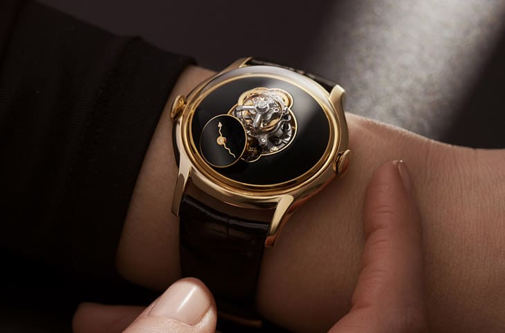 ▲MB&F的女錶LM FlyingT改成黃金材質搭配縞瑪瑙面盤,外觀顯得優雅簡約,烘托出立體機械結構的獨特性。