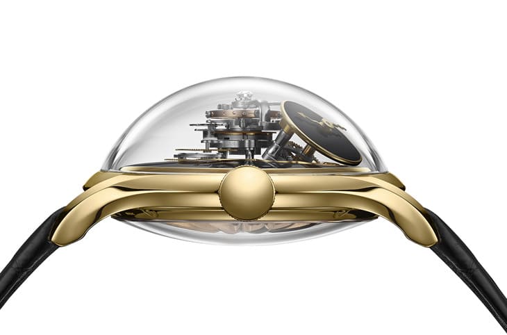 ▲錶款擁有水晶凸狀穹頂鏡面,完整包覆內部的立體機芯,從錶側可以看到陀飛輪裝置聳立於機芯中軸。