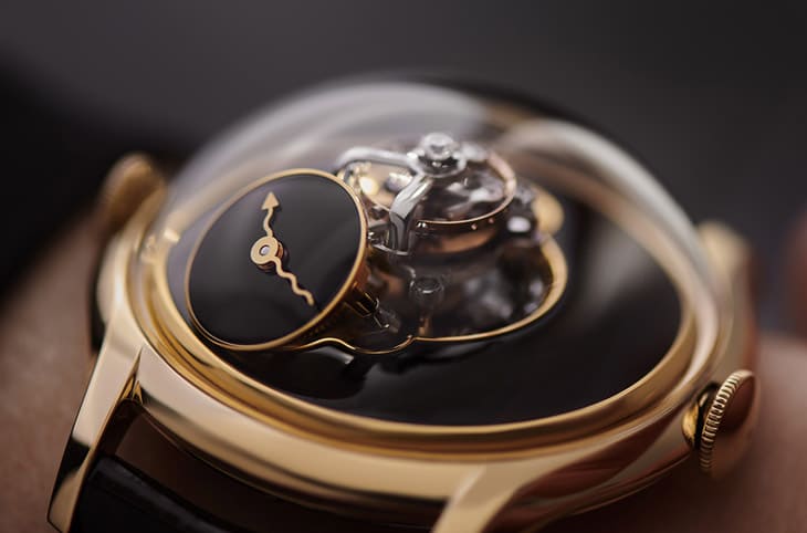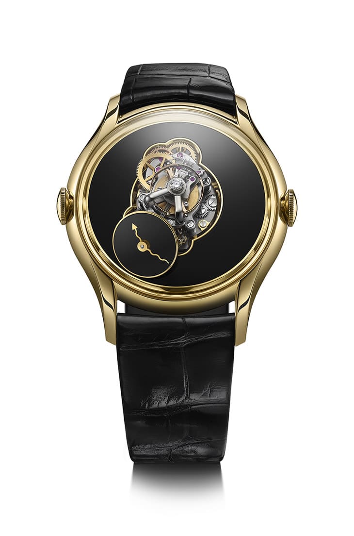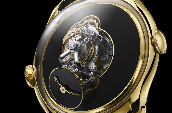 MB&F將偏心小錶盤傾斜50度安排於7點鐘方向,上頭與錶殼呼應的黃金指針呈現波浪狀造型強調手錶不遵循傳統那種嚴肅、工整的設計風格,包括中置陀飛輪也和面盤整體調性一致採不對稱形式,陀飛輪的上層支架以雙拱懸吊取代品牌常用的對稱戰斧造型,同時品牌還在陀飛輪框架軸心鑲上一顆鑽石,當陀飛輪自轉不息時,鑽石也會跟著旋動反射出動感璀璨的光芒。