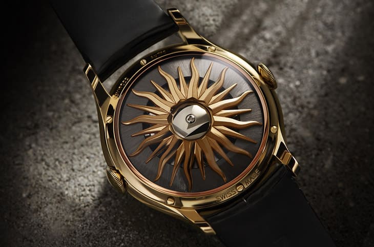 面盤上露出部分的機芯結構之餘,翻到錶背所呈現的畫面可能跟原本預期的不太一樣,因為透明底蓋之下並沒有露出機芯密致的板件結構,反而只見偌大的太陽形狀自動盤以及機芯背面側周圍的深灰色機板,精緻立體的自動盤呈現有機線條造型,這種放射狀的造型和小錶盤的波浪指針隱隱有彼此對應的味道。