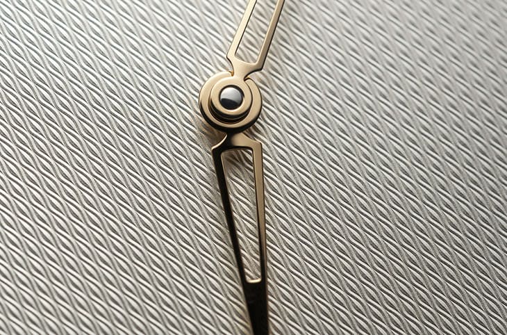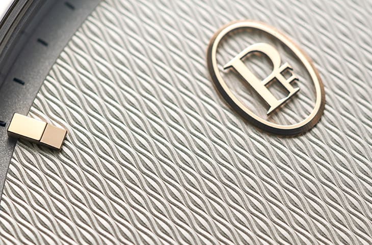 錶款面盤為簡單的二針格局包括面盤外圍的立體時標以及12點方向的品牌標誌也都同樣呈現出精工細作的職人匠心,就以品牌標誌而言,"PF"兩個字母和橢圓形外圈邊緣都經過細緻的雙側倒角打磨,因此在面盤上看起來立體感強烈,至於鏤空的金質指針,則能夠讓人更盡興地欣賞面盤上的機刻大麥粒紋,Tonda PF採用的機刻雕花被認為抓住大小之間剛剛好的平衡,使得手錶不會看起來細膩到幾乎無感,也不至於因為紋理太大而顯得過於張牙舞爪。