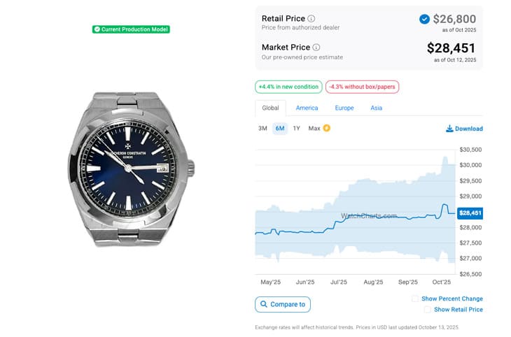 原本詢問度還算可以的鋼殼藍面Overseas大三針在前幾年嚐到爆紅滋味時,變得愈來愈難入手,二級市場價格也是扶搖直上,從有折扣空間成長至超定價水準,不過Overseas系列整體而言畢竟不像AP和PP的絕代雙驕那麼炙手可熱,所以系列旗下款式超定價款式相對較少,主要還是鋼殼藍面最受青睞。根據高級手錶市場調查研究機構WatchCharts的資料,4520V(大三針)在2025年4月時,國外報價約為27,770美金(約合台幣85萬3)已經可以窺見手錶的行情沒有像之前那麼夯了;另款鋼殼藍面Overseas目前功能最頂的陀飛輪款式(6000V)若也把時間拉遠點至2025年4月時,它的行情則是78,556美金(約合台幣241萬4),看似驚人,但其實這數字比手錶的國外定價129,000美金已經親切許多。