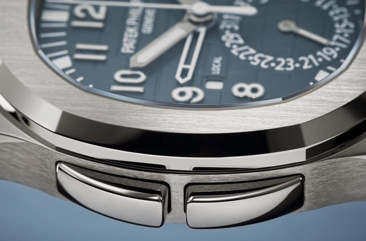 這兩款錶在左側錶殼的8點和10點位置都分別設置了一枚按把,這就是百達翡麗兩地時間錶被公認可以輕鬆調校的關鍵武器,在正常情況下,所在地指針和原居地指針是重疊的,你可以把它視為基礎的大三針加日期顯示,不過如果你今天飛到國外,那倒也不用辛苦地轉動錶冠調半天把時間調成和當地一樣,這時你只需要按壓8點或10點方向的按把就行了,兩枚按把都是用來快調所在地時針,按一次8點方向的按把,所在地時針就會順時針前進一小時;相反地按一次10點方向的按把,所在地時針則會逆時針倒退一小時,以此類推,直到你把時間調整成當地時間就可以了。