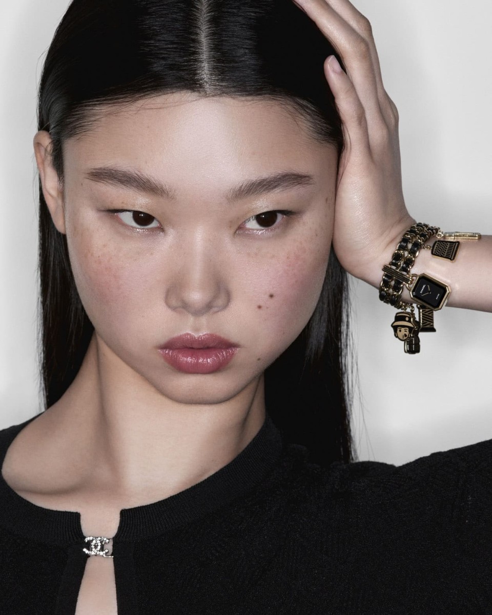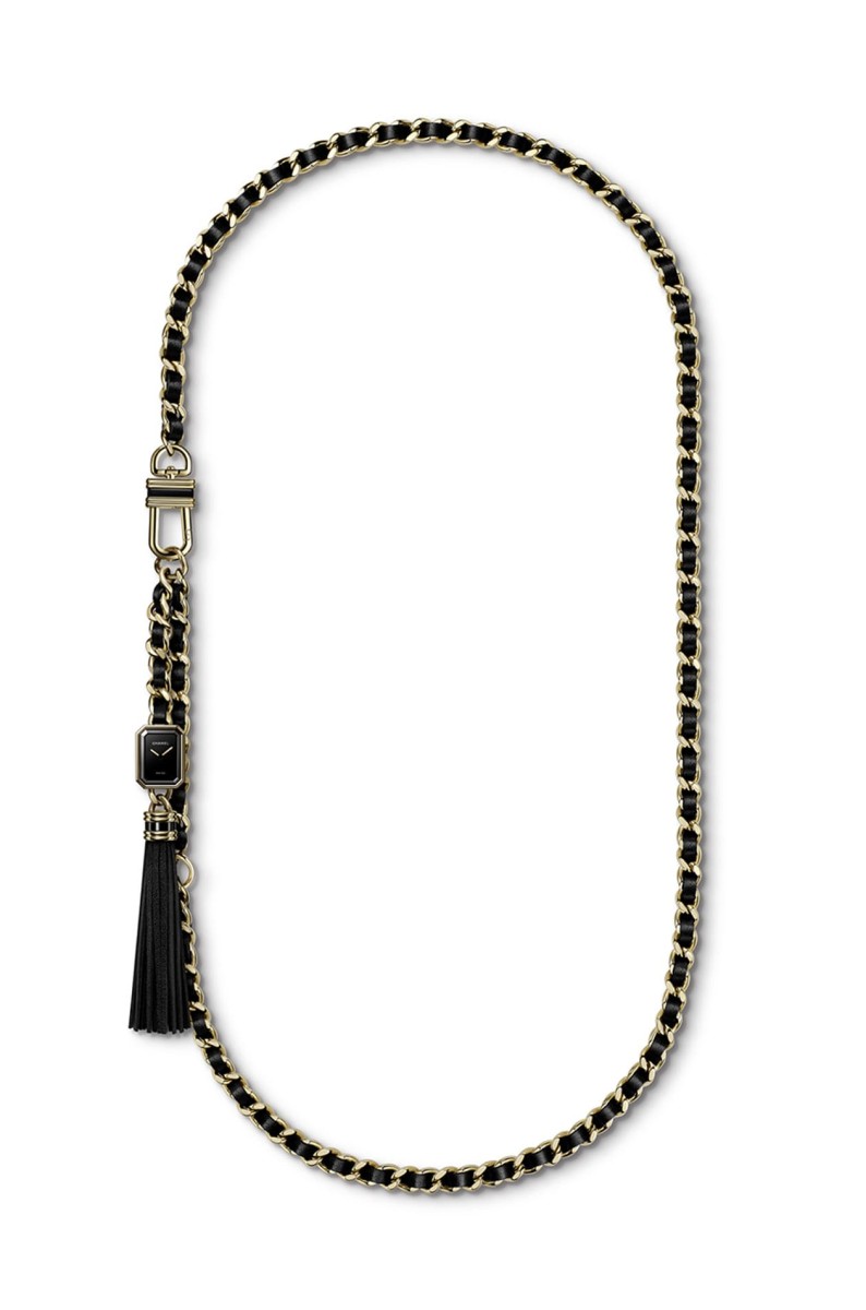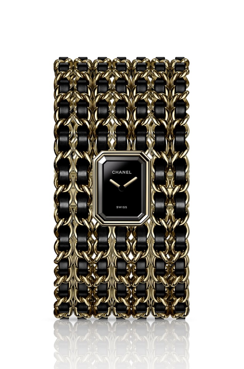香奈兒腕錶創意工作室總監Arnaud Chastaingt 2024年將Première腕錶的雙排鍊帶一口氣延展為七排,鍊帶同樣以經典包款為繆思,於鍍金精鋼鍊帶穿上質感優異的黑色皮革,如此一來腕錶蛻變為佩戴在手腕上範圍更大的手鐲錶,相較於Première腕錶的原創款,誇張版的皮革穿鍊錶帶更引人注目,並將顯示時間的錶殼組件低調地融入鍊帶中。香奈兒將腕錶同時轉化為腕間飾品,尺寸縮減的錶殼在鍊帶上既不顯突兀,其手鐲扣環部分也承襲Première腕錶風格,改為扁長型以提升手鐲錶佩戴時的舒適性。