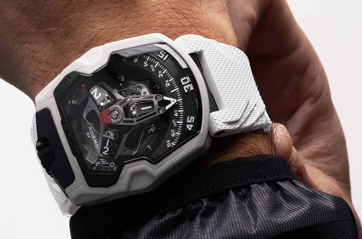 UR-230此一型號為URWERK在2023年的創作,首發作品UR-230 Eagle以灰黑色CTP碳薄層製作,它的外觀就和前述的傳統印象一致,黑得徹底的設計搭配URWERK獨家的漫遊衛星小時顯示系統,洋溢著來自未來的獨特風格。相隔一年後UR-230的接班作登場,名為「北極星」UR-230 Polaris錶如其名,外觀呈現出搶眼的純白色調,從中突顯出URWERK在材質研發領域中又有了新的突破。