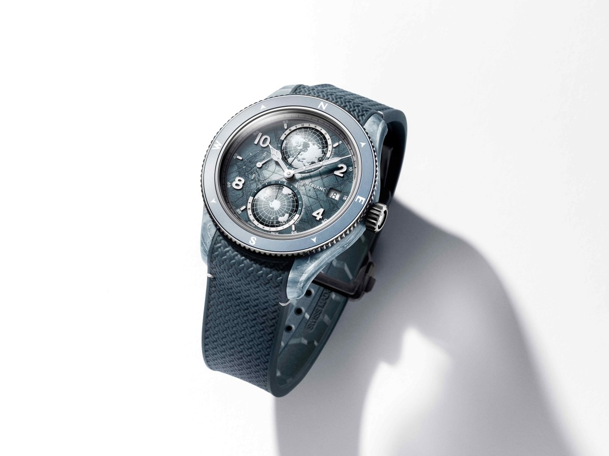 新款腕錶採用了43.5公釐的鈦金屬錶殼,並且搭配了一種全新的複合材質錶殼中層,這種材料由石英纖維、鍍鋁玄武岩纖維、碳酸鈣及淺藍色樹脂構成,呈現出如南極洲古老冰川般的色彩和紋理,充分表現了凍結千年的冰晶體縱橫交錯的形態。這樣的設計不僅美觀,還具備實用性,特別是錶殼左側的文森峰輪廓,白天發出白光,夜晚則發出藍光,增加了整體的可視性。