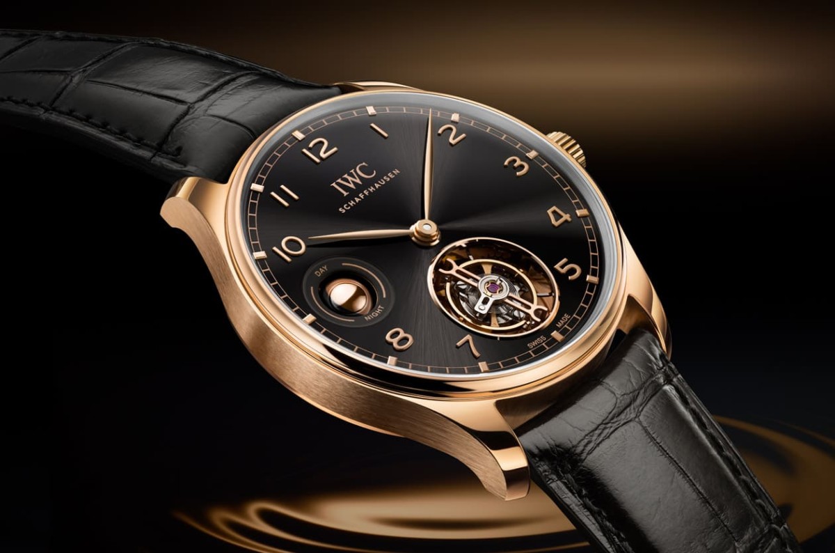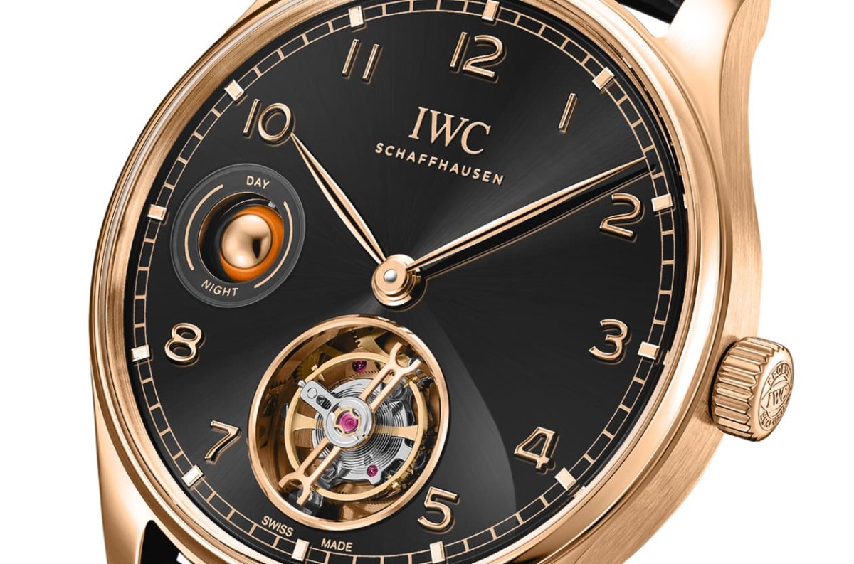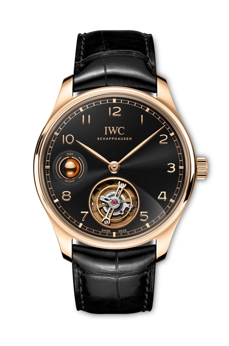 ▲葡萄牙手動上鍊陀飛輪日夜顯示腕錶亦採用Armor Gold?材質,結合立體球形日夜顯示與飛行陀飛輪,展現獨特視覺層次。