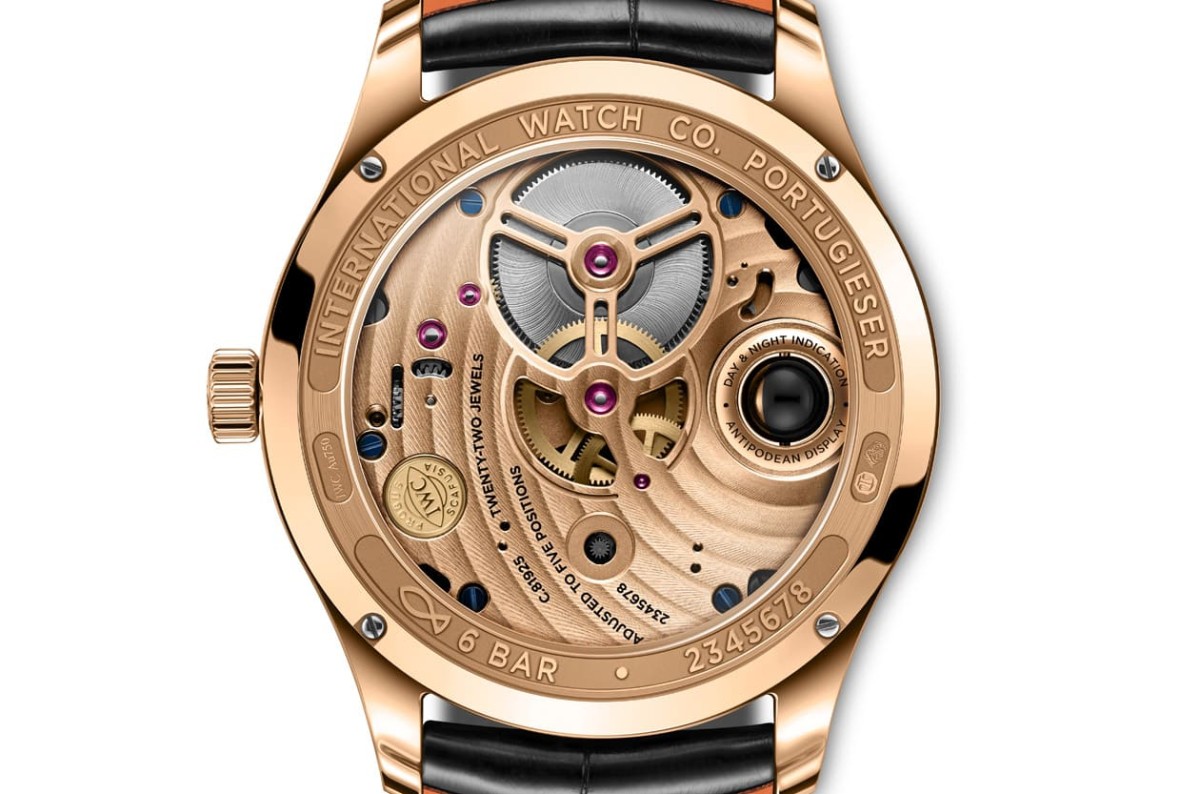 葡萄牙手動上鍊陀飛輪日夜顯示腕錶搭載IWC自製的81925手動上鍊機芯,該機芯蘊含22顆寶石軸承,震頻為每小時28,800次(4Hz),具備長達84小時的動力,足以應付多日未上鍊的情況。這枚機芯是從IWC既有的陀飛輪基礎機芯延伸設計而來,特別之處即在於成功整合創新性的球形日夜顯示裝置,同時維持纖薄的結構比例,透過藍寶石水晶底蓋,亦可一覽其經鍍金處理並飾有日內瓦波紋的橋板修飾,兼具技術與美學表現。