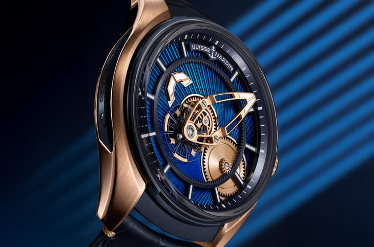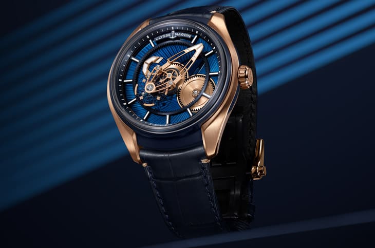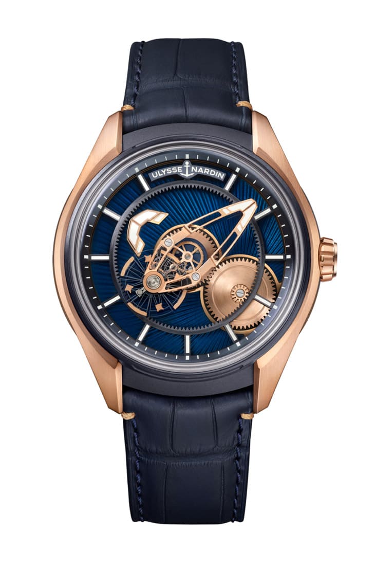 玫瑰金、藍色PVD鈦金屬材質/UN-230自動上鍊機芯/時、分顯示/卡羅素裝置/藍寶石水晶鏡面、透明底蓋/防水50米/錶徑43mm/參考價:NT$ 1,477,000