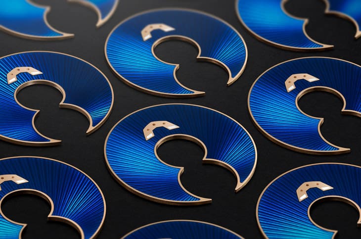 ▲奇想系列首度搭載琺瑯面盤,以22K玫瑰金為基底,採用深藍色半透明機鏤琺瑯工藝,由Donzé Cadrans工坊手工燒製,每枚歷經多次高溫鍛燒,呈現獨一無二的層次與光澤。