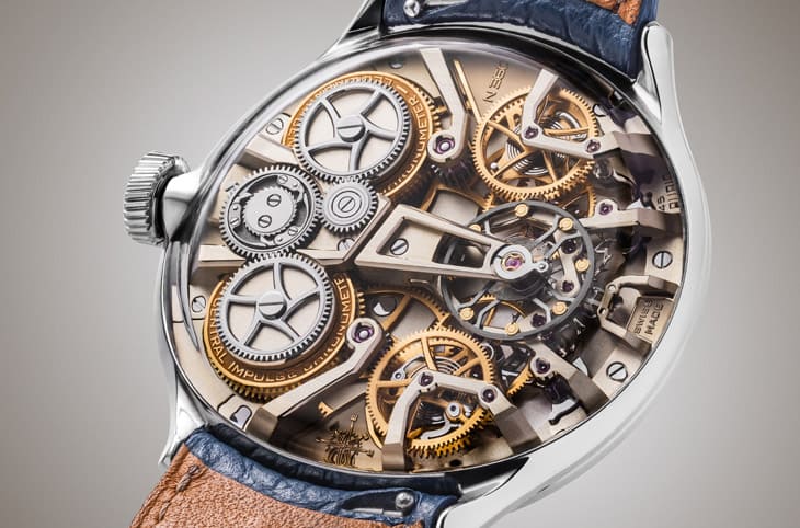 不鏽鋼材質/手動上鍊機芯/時、分、小秒顯示/雙衝擊擒縱系統/藍寶石水晶鏡面、透明底蓋/防水30米/錶徑39mm/限量生產/參考價:NT$ 6,320,000