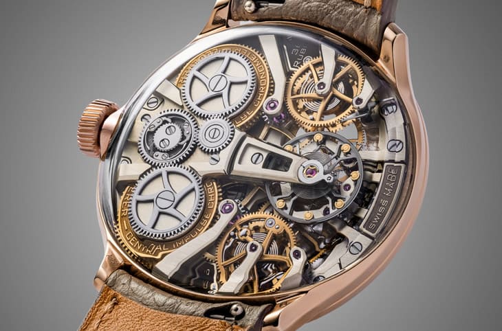 18K玫瑰金材質/手動上鍊機芯/時、分、小秒顯示/雙衝擊擒縱系統/藍寶石水晶鏡面、透明底蓋/防水30米/錶徑39mm/限量生產