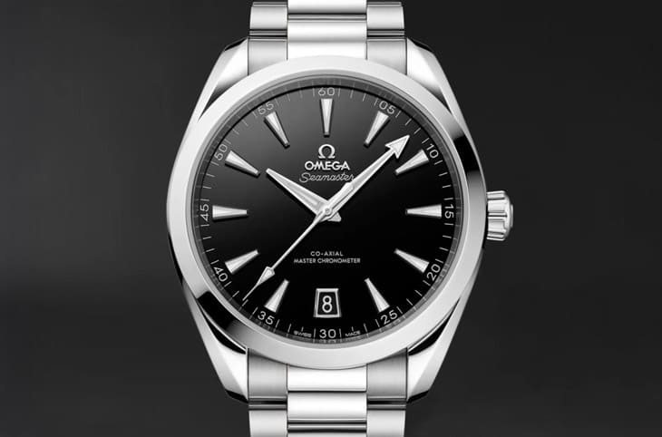 ▲這款海馬Aqua Terra 150米搭載8900大師天文台機芯,具60小時動力與150米防水,錶殼與鍊帶皆為不鏽鋼,搭配黑色漆面錶盤,設計沉穩內斂。