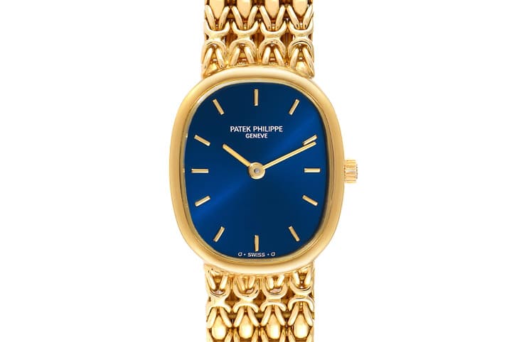 ▲這款約1993年製作的百達翡麗老錶,以黃金比例的橢圓形錶殼、藍色太陽放射紋面盤與手工雕花黃金鍊帶聞名,搭載石英機芯,展現優雅與經典品味。Source:SwissWatchExpo