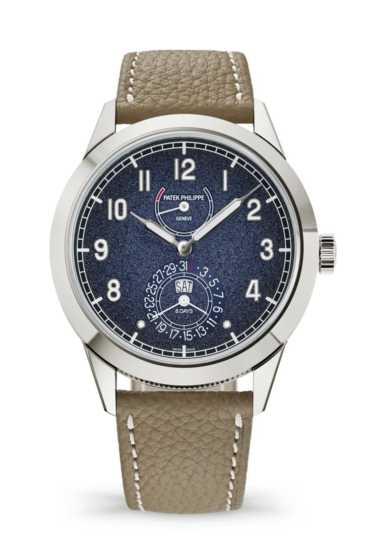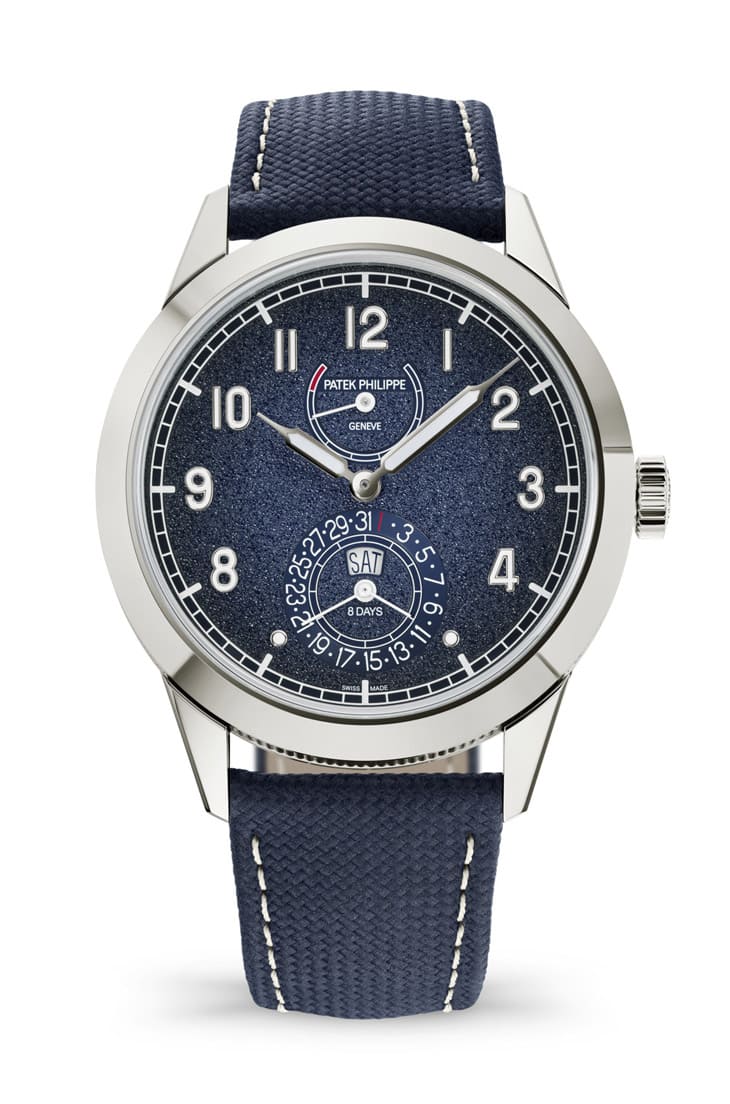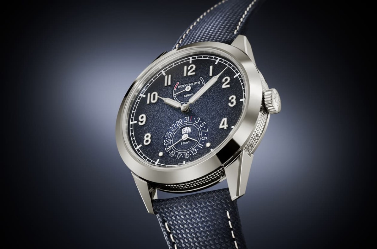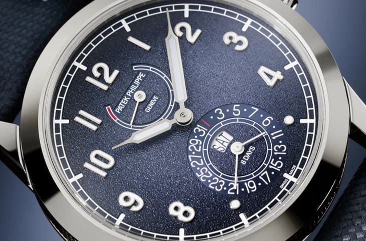 面盤是這款錶吸睛度最高的部分之一,它採用粒狀霧面質感的海軍藍,從中央漸層到邊緣的黑色,營造出如同煙燻般的深邃感,這種紋理在2022年的5226G首次登場,如今延伸到這款複雜功能手錶上。面盤佈局走的是「儀器風格」,所有資訊沿垂直軸線上下排列,清晰又理性,12點鐘的弧形動力儲存顯示與6點鐘的小錶盤呼應,後者同時整合了秒針、指針式日期與星期視窗,功能豐富卻不顯雜亂。這樣的直線排布,也讓人聯想到5236直列式萬年曆,展現百達翡麗一脈相承的設計哲學。指針與時標是針筒形配立體阿拉伯數字,讀時清晰,夜間也一目了然。這種設計在百達翡麗的歷史裡並非孤立存在,從5172計時碼錶到1940年代夜光古董錶,都能找到血脈相連的線索;可以說,5328G的面盤是「經典與當代」的交會點,既有儀器錶的務實氣質,也有高級時計應有的優雅。