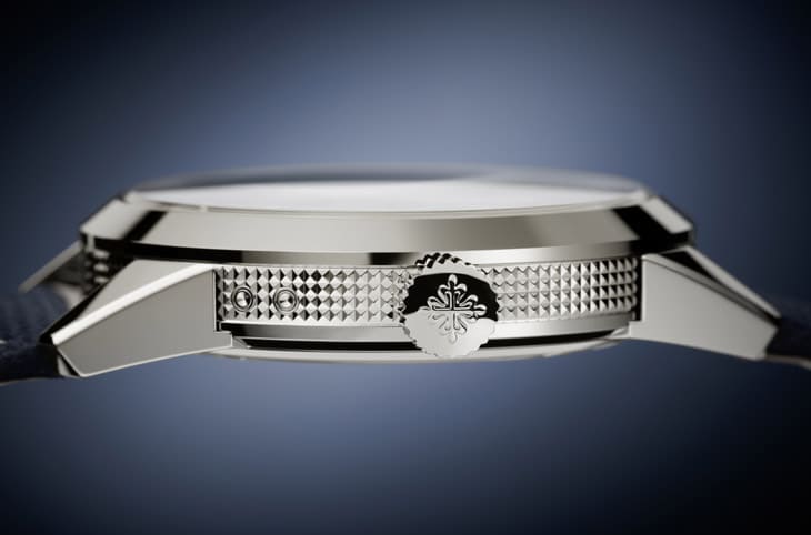▲白金錶殼側面設有巴黎釘紋,錶耳與底蓋一體成型,外觀現代卻保留工具錶氣息,比例厚實穩重,展現百達翡麗低調而獨特的設計語言。