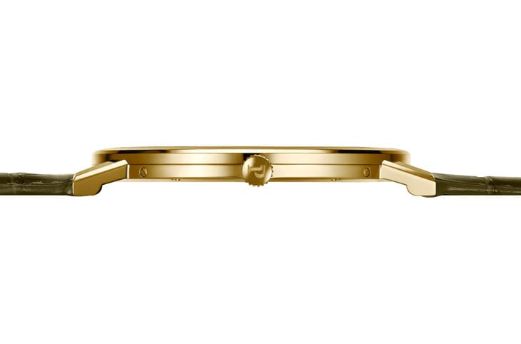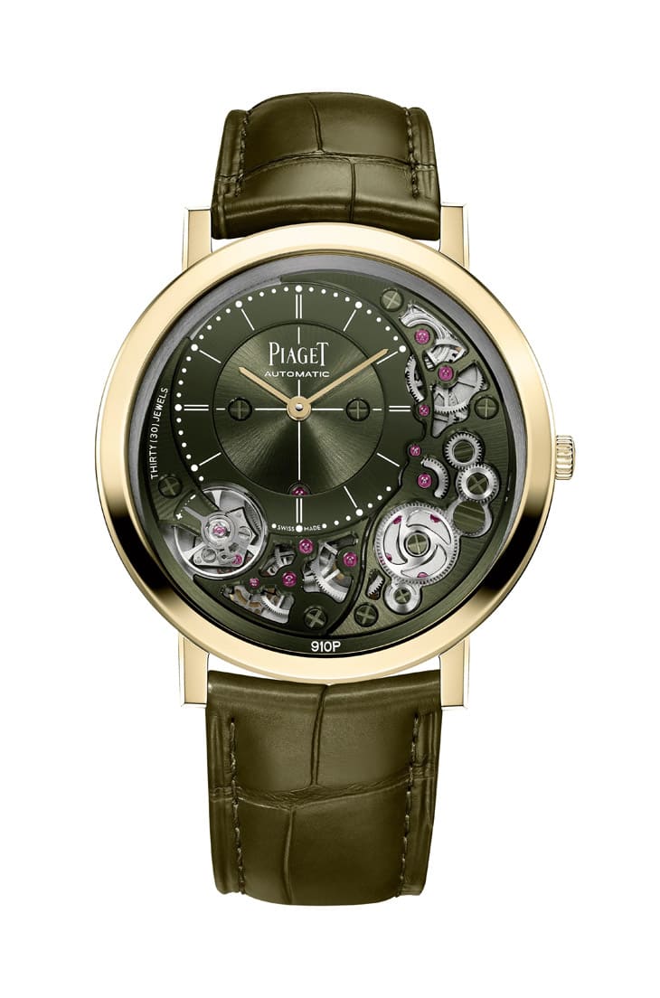 Altiplano Ultimate自動錶搭載的910P自動上鍊機芯,震頻為21,600次/小時,動力儲存達50小時,直徑41mm的錶殼比例適中,防水深度同樣為20米,搭配綠色鱷魚皮錶帶,優雅與穩重兼具。