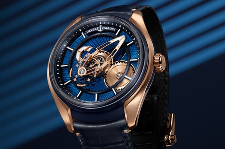 玫瑰金、藍色PVD鈦金屬材質/UN-230自動上鍊機芯/時、分顯示/卡羅素裝置/藍寶石水晶鏡面、透明底蓋/防水50米/錶徑43mm/限量120只/參考價:NT$ 1,477,000