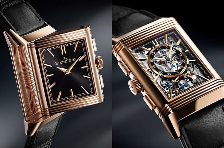 ▲這款Reverso以玫瑰金打造,搭載積家860手上鍊機芯,招牌設計能雙面翻轉,尤其背面開面計時與逆跳計時盤,兼具工藝美感與實用功能。