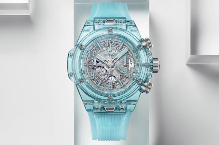 ▲宇舶Big Bang Unico湖水藍寶石計時碼錶以藍湖靈感打造通透夢幻錶殼,搭載HUB1280機芯,融合材質創新與鏤空美學,成就前衛傑作。