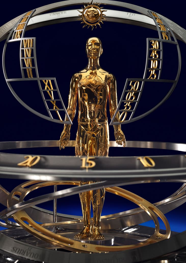 ▲天文學家動偶以青銅鑄造並鍍18K黃金,身上雕刻星座並鑲嵌132顆鑽石,姿態優雅地指示時間,將人偶由裝飾昇華為具複雜功能的報時結構。