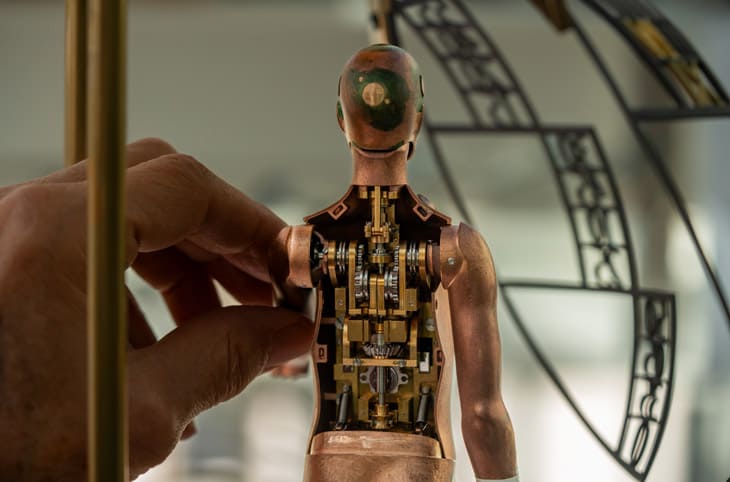 若說穹頂與天文鐘承載著天文科學的精準,那基座就是情感與藝術的舞台,內部裝置能驅動天文學家人偶展現144種姿態,靠的是158個凸輪組合而成的複雜系統。當人偶啟動時,隱藏於基座的金屬琴與哇音管會響起,由法國知名音樂人Woodkid譜寫的三首旋律隨之流淌,每場演出長1分30秒,可以按需求啟動,也能設置在24小時內自動上演,讓這場「時間劇場」自動上演。