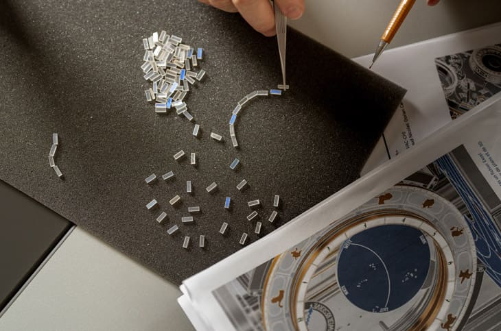 La Quête du Temps座鐘並非單一工坊的孤立創作,它是跨領域協作的縮影,江詩丹頓攜手機械人偶大師Fran?ois Junod、專業鐘錶品牌L’?pée 1839,以及日內瓦天文台科學家,共同實現這座宏作。從珠寶鑲嵌、珍珠貝母細工、水晶內嵌、琺瑯彩繪,到青銅雕塑與玻璃微繪,每一種工藝都在這件作品中留下印記,天文學家人偶身上的132顆鑽石,象徵主要星辰,金色表面則由18K黃金鍍層點綴,讓科學與美學渾然合一。
