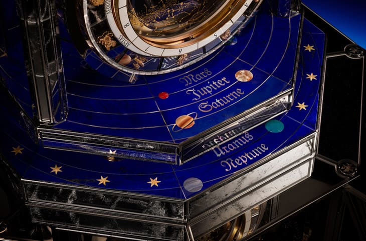 ▲基座頂層以青金石為背景,搭配多種硬質寶石刻劃太陽系,地球以藍銅礦、火星以紅碧玉、木星以碎紋瑪瑙,並以珍珠貝母嵌片呈現各行星名稱,營造星河景致。