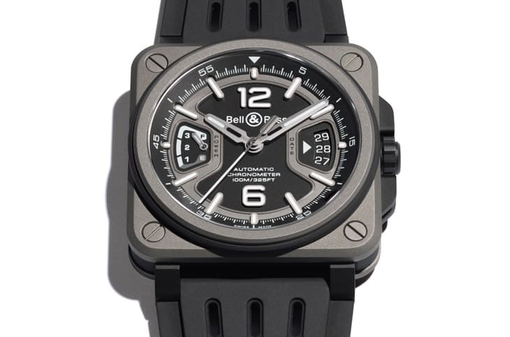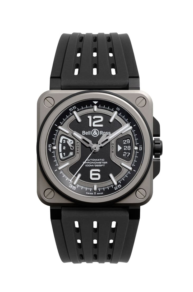 BR-X3 Black Titanium的設計相當能展現這種革新思維,它的錶殼採用三明治式的多層結構,灰色鈦金屬板上下夾持,搭配四顆螺絲將整體牢牢固定,不僅堅固耐用,同時提供顏色與材質的更多組合可能。2級微噴砂鈦金屬具備極高強度卻重量輕盈,比不鏽鋼輕三分之一,長期廣泛應用於航空與賽車領域,佩戴起來舒適親膚,並且能承受極端環境挑戰,搭配黑色坑紋穿孔橡膠錶帶,成就透氣與輕巧的佩戴體驗。