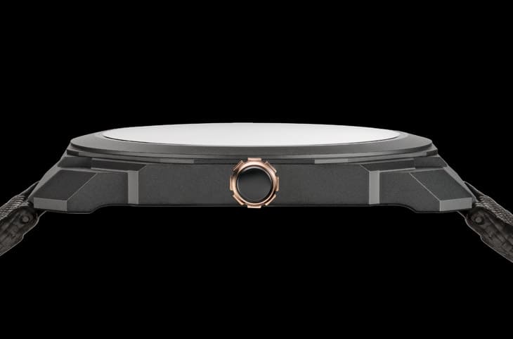 ▲DLC鈦金屬錶殼融合義大利設計與瑞士工藝,黑色霧面質感搭配玫瑰金點綴,展現奢華與運動兼具的氣息。