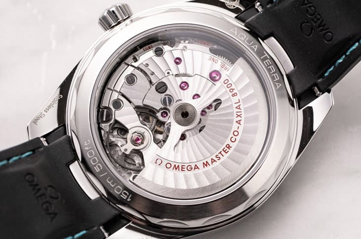 41mm款式搭載的8900機芯具備雙發條盒結構,動力儲存達60小時,比38mm版本的8800機芯更充足,最關鍵的是,它通過了瑞士聯邦計量研究院(METAS)的大師天文台認證,意味著整只錶的精準度、抗磁性能、抗震與穩定性都達到極高水準,抗磁能力高達15,000高斯,這在日常電子干擾環境中幾乎是「免疫」級表現。8900機芯還有一項便利設計,它的時針可獨立以一小時為單位快調或倒調,而不影響分秒針,對於經?鐣r區出差的佩戴者而言,這個設計比傳統GMT更直覺實用,透過透明底蓋可見機芯的鍍銠夾板與日內瓦波紋裝飾,擺輪與螺絲也經黑化處理,展現歐米茄一貫的工藝講究個性。8900機芯的穩定結構與實用功能讓這只手錶在顏值之外,更具專業時計的深度內涵,這正是Aqua Terra能在同級競品中長年維持優勢的關鍵。