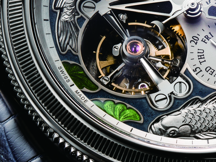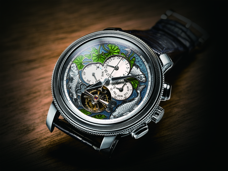雖集四大腕錶複雜功能, Toric Tecnica Carpe卻先以細膩的盤面設計領銜鑑賞,從工藝角度出發,讓人在荷池錦鯉中,仔細欣賞PARMIGIANI打造的自然景致。