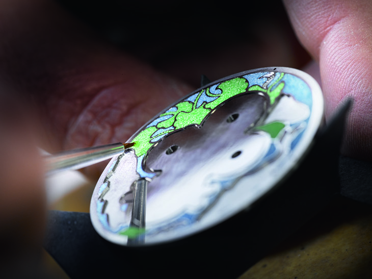 大明火琺瑯是許多工藝錶都會用上的工藝,此工藝需要反覆施繪並於800°C至900°C的高溫燒製,每次燒製皆會營造不同的層次,為盤面添上立體感。