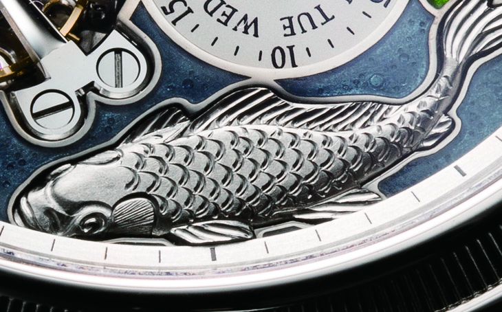 盤面上的精緻白金錦鯉以手工雕刻而成,特此致敬愛德華.馬塞爾.山度士。熠熠生輝的鱗片和幾近透明的魚鰭令錦鯉呼之欲出,細膩極致。