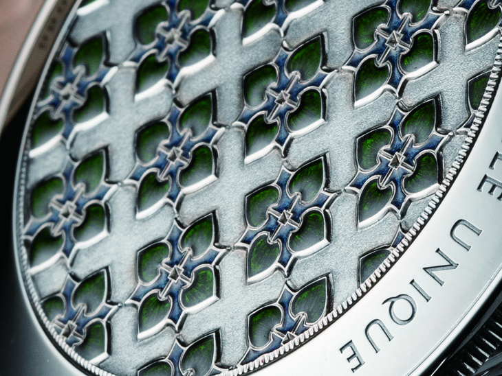 呼應腕錶主題與設計,鉸鏈式雙錶底蓋施以雕刻和琺瑯兩種工藝,設計出優雅的荷葉圖案,相關設計巧思同樣可見於錶耳、錶扣及機芯橋板上。